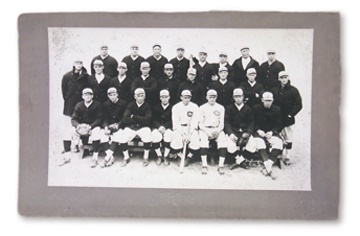 Awe-inspiring piece pictures the underdog National League squad that was handed the World Championship by Shoeless Joe and his fellow Black Sox conspirators. Vintage shot was snapped by F. Boellinger Studios, and is marked as such by writing scratched in the negative at bottom right, imprint at bottom center of mount and sticker on back. Foxing of image is heavier at corners than in center, and only adds to the patina. Condition is remarkable otherwise. Surely the finest specimen of this coveted prize in existence.