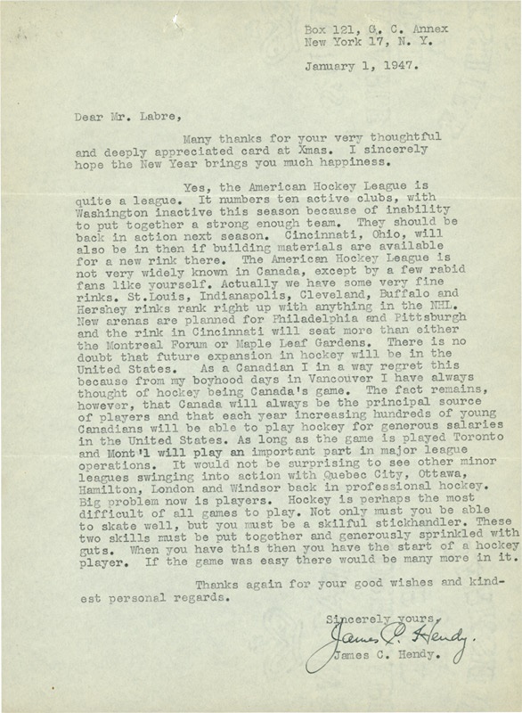 Jim Hendy is a very important part of hockey history. He was a writer who is credited with being the source of origin for the keeping of stats in hockey since the 1930's. For all of his accomplishments, he was inducted into the Hall of Fame in 1968. He published the first edition of The Hockey Guide in 1933, and continued to produce it annually until 1951, when competing pressure from his other hockey jobs forced him to stop. Letter speaks glowingly of the expanding future of hockey throughout the United States. At the time of its writing he was the NY Rangers Secretary. One tiny tear (not on text), and two folds. Otherwise, NRMT.