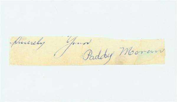 The Quebec Bulldogs goaltender led the National Hockey Association in games won with ten in the 1911-12 season, and followed up with a league leading 16 wins in 1912-13. The Bulldogs won the Stanley Cup in both seasons, and Moran was selected to play for the NHA All-Stars in 1912. He was absolutely tenacious in net, making sure to let any of the opposing players who wandered too close know they did not belong there. Moran was inducted into the Hockey Hall of Fame in 1958. Cut is signed "Sincerely Yours, Paddy Moran" (8/10). An extremely tough HHOF autograph to locate, as he died in 1966.