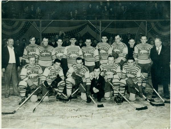 Signed team photo of the Detroit Falcons from an era when athletes were allowed to crack a smile in a photo. Features the Coach Jack Adams, Aurie and Lewis from their top line, Smith and Kilrea. The rare HHOF autographs of Reg Noble, Alex Connell (a beautiful, large example) and Eddie Goodfellow. Fourteen signatures in total. Signatures are all (9/10). Photo (9-1/2 x 7-3/8") is EX-MT with some very minor damage on a few edges.