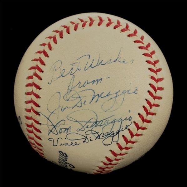 Unofficial MacGregor ball is in pristine condition and carries the signatures of the three DiMaggio brothers all together on the same panel. In Joe's handwriting is "Best Wishes from -" followed by Joe’s, Dom's and Vince's signatures. Very rare in this form. Vintage signed in the 1950's. Ball is NRMT-MT while Joe and Dom are 8/10 and Vince is 9/10. Only the three brothers have signed this ball. No one else!