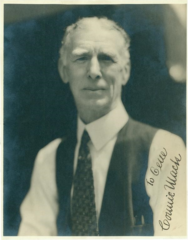 Fine 8 x 10" image of Connie Mack by esteemed photographer George Burke is in Near Mint condition. The A's manager/owner autographed the picture, in an aging hand, with an inscription "To Gene Connie Mack". Was done in thick black fountain ink. The writing is 9/10 overall. Burke's stamp on the back of this rare signed photo.