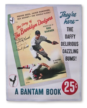 1948 poster shows Pee Wee Reese making the pivot at short. Shows this well-known paperback book's cover with "They're Here - The Daffy Delirious Dazzling Bums!" By Hy Rubin with "Introduction by Red Barber." The top reads, "Pee Wee Reese, Jackie Robinson, Rex Barney - The Whole Flock!" Signed in black marker by the aforementioned Rex Barney. Huge 25-cent price tag (no more!). Mounted on linen, NRMT.