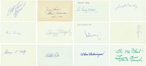 Clean group of a dozen 3 x 5" index cards bearing the autographs of Hall of Famers featuring a beautiful Roberto Clemente. Also included here is Satchel Paige, Hank Greenberg, Gabby Hartnett, Casey Stengel, Ford Frick, Jesse Haines, George Kelly, Ted Lyons, Frank Frisch, Joe McCarthy and Chas Gehringer. All but Paige and Hartnett are on the unlined side. Each signature is a 9 or 10. Group is Near Mint to Mint. Very tough to find a real Clemente on an index card.