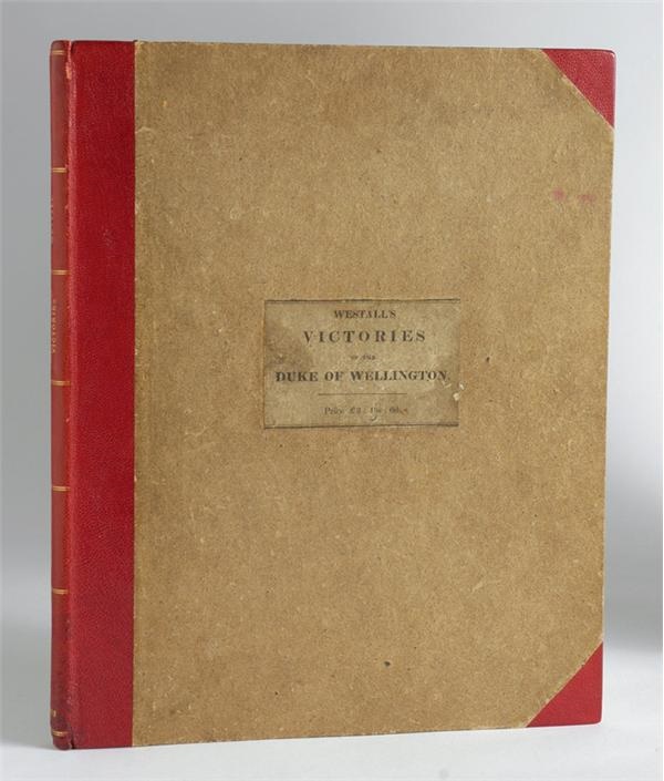 A very scarce book of great historical interest, "Victories of the Duke of Wellington", by Richard Westall, R.A. (Rodwell & Martin, London, 1819) is a masterly survey of Wellington's successful military campaign against Napoleon. A 12 1/4" x 10" quarto bound in red morocco and boards, the 48-page volume features twelve vivid aquatints by noted painter and illustrator R. Westfall (1765-1836). Wellington's campaign, beginning in 1808 and ending decisively at Waterloo in 1815, is superbly captured and chronicled by the twelve aquatints, with summary text serving as detailed captions for each battle. Overall condition is VG-EX, with a tight binding. This scarce volume has realized prices in excess of $3500, and will surely be a centerpiece in any collection.