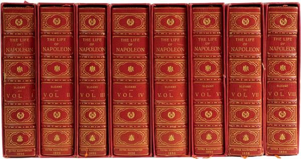 The crowning jewel to any Napoleon library or collection would have to be this eight volume compilation of "The Life of Napoleon" special extra illustrated copy by William Milligan Sloane. Publisher, The Century Co., New York, 1896. Sloane gained worldwide recognition in 1896 when he led the fight to have the Olympics brought back to world recognition from its ancient origins in Greece. A history professor at Princeton, he researched tirelessly to document each facet of the Emperor's life. Each volume is replete with over a hundred illustrations in black and white and full color taken from original engravings and prints. Each is gilded and is inserted in its' own hard sleeve. The front and back covers are beautifully embossed and bear the Bonaparte Crest. The inner covers and opposite pages are satin-clad. The complete set of eight comprise over 2,400 pages. All are in general excellent condition except for three volumes that show some splitting between the covers and the spine.