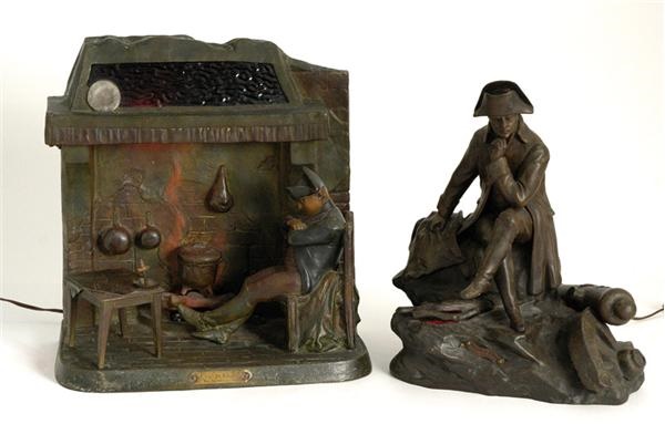 The den of any serious Napoleon collector would be the natural resting place for this pair of turn of the Century spelter sculptures in large format. The first titled "Veille de Wagram" (Vigil at Wagram) displays a slumbering Napoleon crossarmed in front of an open hearth. When lit, it emits light from under the cauldron and over the mantle. One is left to imagine whether this scene is before or after the Battle of Wagram in which he defeated the Austrians. The brass title tag credits Salesio as the sculptor. The piece is EX, complete and measures 15WX14HX8H". Secondly, titled "Napoleon au Bivouac", Bonaparte sits on a large rock with a field map under his right hand while pondering his next opponent. The remnants of a destroyed cannon lay to his left. When lit, the embers of a camp fire flicker below. The piece is missing the wooden base but is otherwise complete and stunning. Signed by the sculptor Lemoyne, it measures 17Wx14WX12H".