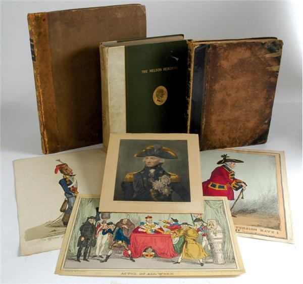 Historic collection of period prints and books related to Napoleon's British archrivals Lord Nelson of Trafalgar and the Duke of Wellington. 1. Three 11X14" hand-watercolored prints parodying the Duke Of Wellington c. 1825, 2. 9X11" engraved print of Lord Nelson victor at Trafalgar c.1825, 3. Hardbound limited edition copy #63 of "The Nelson Memorial" by John Knox Laughton, 1896, overall condition VG. 4. Original hardbound 1st edition of "The Wars of Wellington" by DR. Syntax, published by W.T. Gilling, Suffolk, Street, London, UK., 1821. Six color engravings, gold leaf spines, complete G/VG condition. 4. Incredible first edition of The "Life of Lord Viscount Nelson", by T.O. Churchhill, engraved, complete and original in G cond., 1808. Rare and important books.