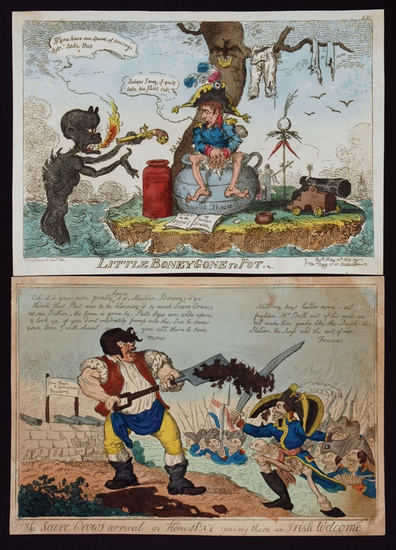 In the true spirit of political satire, the father and son team of Issac and George Cruickshank depict Napoleon Bonaparte as a skeletal weasel in two hand-watercolored etchings. George titled his "Little Boney Gone to Pot". Issac gave you the choice of two titles, "The Scare Crows Arrival" or "Honest Pat Giving Them An Irish Welcome". Both measure 9 1/2 x 13" and are in excellent condition with slight staining on the right side of the "Honest Pat" edition. If you think satire is over the edge now, you have to own these. Great early 19th century history lesson.