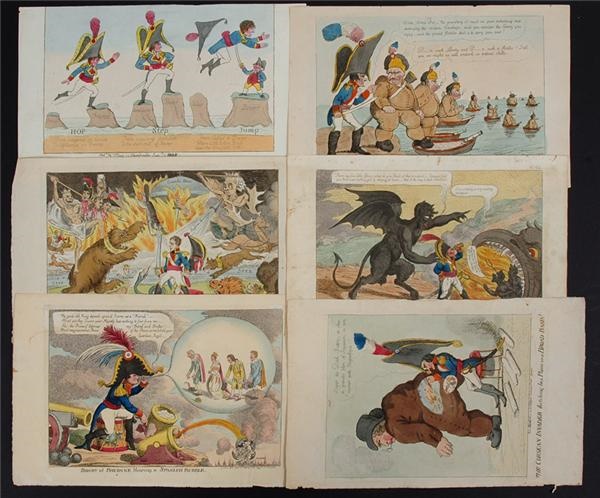 Dating from the period 1804-1812, these original engravings are beautifully hand-colored, and caricature Napoleon as his glorious ambitions are exposed and thwarted at every turn. Published in London by Thomas Tegg, one of the largest booksellers of the period, the 17" x 11" prints are extremely well struck and vividly colored. As a group, the prints provide a fascinating perspective on English public reaction to Napoleon and his wars, with anger and disdain fueling each of the images. In the 1812 print, the creatures and flames of Hell itself surround the fading Emperor as he brandishes a broken sabre. Amazing! Some edge and corner wear, including minor chips and tears, all of which is limited to the wide borders. One print has been too tightly cropped along its top edge, with the border wholly missing; however, the central image is not affected. Overall condition is EX.