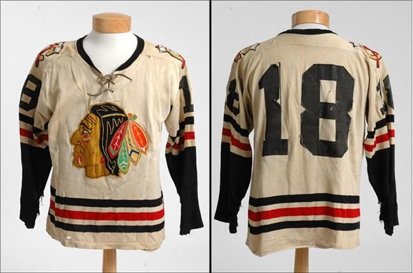 An outstanding Chicago Black Hawks jersey, game-worn by the famous #18, Chico Maki. Outstanding multi-colored Indian Head on front, with the crossed tomahawk logo on each shoulder. All original with lots of wear and some team repair. No tags. Both elbows have large holes, with several small holes throughout jersey. Numbers are semi-detached from back. Overall, a beautiful jersey with tons of history and character. Comes with a 1961-62 Black Hawks Program, with some tears and fading, listing #18, Chico Maki, as well as articles and period advertisements. Please note: Wayne Hillman also wore #18 for 19 games that season.