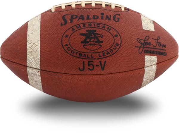 Joe Foss, who became the first commissioner of the American Football League in 1960, died at 87. You’d be hard pressed to find a human being who led a fuller life than he did. World War II fighter ace, he won the Medal of Honor and the Distinguished Flying Cross after shooting down 26 enemy planes. Colonel in the Air Force in the Korean War. Governor of South Dakota. Host of the television show “The American Sportsman” on ABC. President of the National Rifle Association. Football offered here was used in an AFL game and shows the stamp of “Joe Foss Commissioner". Ball shows good use with some grass stains.