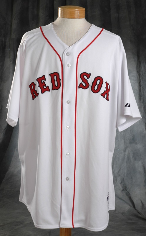Since his arrival on the scene at Fenway, Manny has transformed the beloved, but "cursed" franchise from a pretender, to a contender, to World Champions. During that time even his harshest critics have come to respect his raw power and talents once he steps between the chalk lines. Presented is his beautiful "home" white jersey from 2005 which displays the light use expected in modern jerseys and the classic style of the beloved Sox. Across the chest in double-layer tackle twill is "Red Sox" and on the verso is his large number "24" in the same style. On the tail is sewn a Majestic tag, with embroidered strip tag underneath that reads "24-56-05" (number, size, year). "0062" code inside as well. A nice jersey from one of the truly banner performers in baseball.