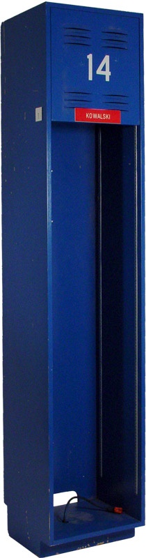 Perfect for displaying your memorabilia is this quartet of four stunning sports lockers that were removed during renovation of a local sports complex.. Each measures a grand 16Dx17Wx85"H and is constructed of composite wood and steel, in addition to being stenciled in white with the numbers "14" (has "Kowalski" nameplate attached), "153", "215", and "216". They show the expected wear from use, with minor scratches and scuffs, overall EX+.