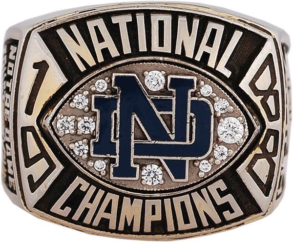 Offered is the ultimate keepsake from Notre Dame's unforgettable season of 1988, a season highlighted by what many consider the greatest victory in modern Notre Dame annals, when the fourth-ranked Irish edge No. 1 Miami, the undefeated national champion, 31-30, at Notre Dame Stadium. On the face of the gold sample ring is Notre Dame's "ND" surrounded by thirteen sparkling faux diamonds and raised lettering that reads "1988 National Champions". On the left shank is "Notre Dame-Trust, Love, Commitment" and on the opposite shank is "Holtz", "12-0-0", and football helmet design. EX-MT, sample is size 12. A brilliant piece marking one of the brightest years in the history of Irish football.