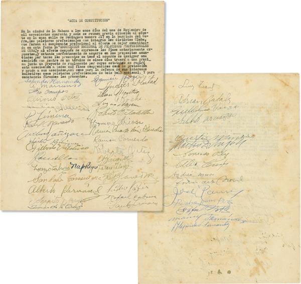A very important piece of Baseball history from 1946, the year from which began what is considered the golden age of Cuban Baseball, this document is signed by many of Cuba’s finest players, including Salvador Hernandez, Nap Reyes, Alberto Hernandez, Luis Tiant, Sr., Minnie Minoso, and Martin Dihigo, to name a few. The content of this Constitution Act translates as follows, “In Havana City, November 11, 1946, Professional Baseball players met at the House # 217 located in Dominguez Street (Barricade of The Hill). The Professional Players that belong to the distinct Clubs and are currently playing in the Professional Championship in effect to constitute .....THE NATIONAL ASSOCIATION OF BASEBALL PLAYERS OF CUBA. After the meeting, a unanimous decision was made to create a commission no more than five days from convening. A new meeting date was set by the commission to discuss rules concerning the association with the purpose of protecting, helping, and defending the association's best interest. This document is being signed by all those present''. Signed by 48 players from Cuba, it is a virtual who's who of Cuban baseball in the 1940's. Signed front and back in ink, signatures average 8/10. Paper has a few stains but still very presentable, VG.