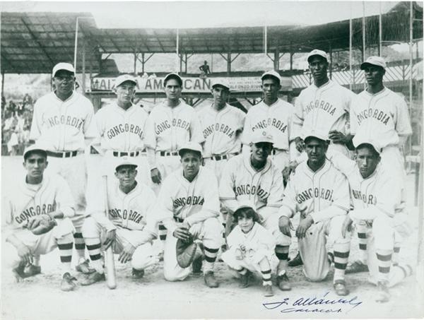 Original team photo taken in Venezuela shows the Concordia team that dominated the league and headlines throughout the 1932-34 seasons. Their success, exciting and entertaining as it was to witness, came as no surprise given the fact that they were sponsored by the son of the Venezuela's dictator, Juan Vincente Gomez and featured a line-up that read like a Latin All Star team roster. Amongst those who took the field were: Player/ Manager Martin Dihigo (member of the Mexican, Cuban, and American Halls of Fame), Alejandro Ohms, Luis Aparicio, Sr., Tetelo Vargas, and Silvio Ruiz. Needless to say, they won the National Championship the same year this photo was snapped in 1934. Overall the photo is EX-MT, with editing marks on the reverse, and signed in fountain ink by the photographer at the bottom. Measures 8"x10".