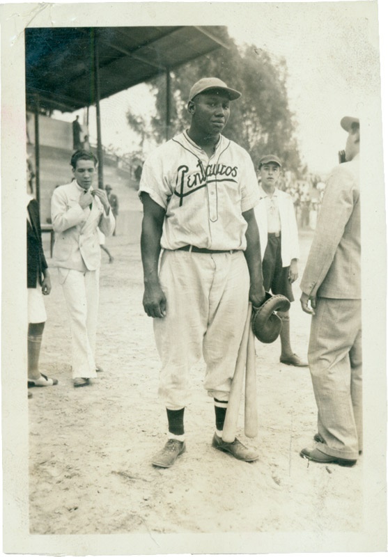 Offered is what may be the most rare of all Josh Gibson photos. In 1940, the HOF catcher, aka The Black Babe Ruth, jumped from the Negro League to play in Venezuela for the Maricaibo baseball club. The Centauros team was loaded with hired guns assembled for the sole purpose of capturing the Venezuela Professional Baseball League crown. This international team of all-stars was disbanded by mid season, though, after the owners could not afford to maintain the extraordinary payroll. Offered is a photo of Gibson taken during that time, the very photo that was used to make the 2005 Panini sticker of Gibson, in uniform and holding his mitt and two bats. Photo is EX with one wrinkle at the top right corner and a minor pencil mark on the reverse. Measures 2.5" x 3.5".