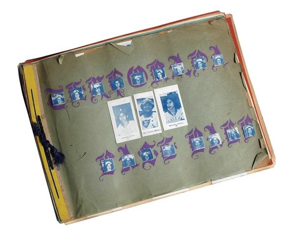 Continuing the tradition of offering our clients the finest and rarest of Negro and Latin Baseball memorabilia, we once again are proud to present one of the scarcest baseball artifacts extant. This 1948-49 Venezuelan complete set in its original album is one of only two complete sets (in album format) know to exist. Finding individual cards from this set is also an extremely difficult task with few in circulation. The album contains (101) professional Venezuelan baseball players, (10) cards of baseball officials, (18) umpires and 256 cards of amateur players in Venezuela including (43) cards of women players. Cards of significant players including some Negro Leaguers are James Pendleton, Sam Nahem, Gentry Jessup, Martin Tabacheck, Roy Welmaker, Parnell Woods, Guigui Lucas, Tony Zardon, Chico Carrasquel, Chucho Ramos, Vidal Lopez, Carlos Ascanio, Luis Aparicio (his true rookie card) and Ortega. Unfortunately, the front cover has long since disappeared; however the back cover is still present and the overall condition of the album pages is EX. Some of the album pages have separated from the string, which binds them to the album. The cards themselves are all in tremendous condition and appear to be nearly all EX or better with several EX-MT and NM examples. Obviously, it is impossible to tell what condition the backs are going to be in should one choose to remove them from the construction paper. However, from our experience in the past, many of the cards from this time period and part of the world were glued into albums with cheap water based glue and can be removed without damage to the backs. The team names and page titles have been stenciled in with a silkscreen technique, which gives the album a personal and artistic touch. Simply put, this should be considered a once in a lifetime opportunity to acquire a truly scarce piece of baseball history. .