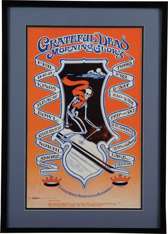 “Trip and ski…,” as only the Grateful Dead could promise, the unique combination of sport and recreation at the Lake Tahoe Kings Beach Bowl, on February 22, 23 and 24, 1968. This first printing concert poster has a heady, chilly evening illustration by artist Bob Fried: the dominant colors are orange and blue, surrounding the central figure of the Dead’s familiar skeleton skiing against a Munchian black and blue sky. 14 x 22 poster is professionally blue-matted inside a 20 x 28 black frame. NRMT condition.