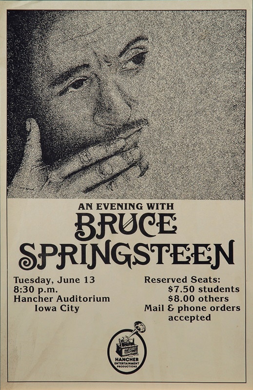Reflecting the muted and overcast forecast on the 1978 gloomy masterpiece, “Darkness on the Edge of Town", this richly detailed poster announces “an evening with Bruce Springsteen". Performed in Iowa City on June 13, 1978, this beige and black poster renders a portrait of the Boss in a vague, complicated illustration of tonal complexity (very unlike the swaggering hipster of his previous “Born to Run” album). Measuring 11 x 16 ?”, there is a slight crease on the upper left corner, and some overall yellowing from age. EX+.