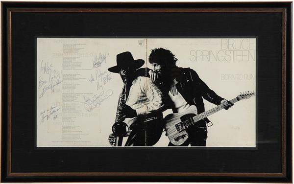 <i>Born to Run</i> is rock's ultimate expression of the urban American experience and "The Boss' " most highly regarded recording. The title song has become a Springsteen anthem and a rock classic and is one of the main reasons Springsteen did not require a single for this album to explode. His live act, even then evolving into the best in the business, had won him a legion of loyal fans in the Northeast Corridor. When this album was released and Bruce was on the covers of <i>Time</i> and <i>Newsweek</i> simultaneously, a media hype he had to be sensational to survive, sales were instantaneous in the Northeast and in places such as Cleveland. An artist who had not even charted with his first two albums went Top 10 within weeks. Offered is that very album signed by Bruce Springsteen, Max Weinberg, Roy Bittan, Garry Tallent, and Danny Federici shortly after its original release. Their blue ink inscriptions and autographs grade collectively, and conservatively, as 9/10 while the cover itself is EX+. Double matted and framed to 20"x33".