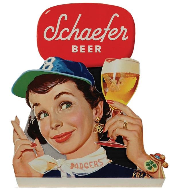 Presented is an attractive Schaeffer Beer advertising sign starring a pretty, young Dodgers fan decked out in her team's cap, scarf, and earrings. Apparently raising her glass and crossing her fingers as she prepares to exclaim "Wait until next year!". Brilliant, unfaded color fills the entire front surface which has maintained its box fresh appearance and the attached easel on back has never been used, NRMT. Measures 15" high and 13" at base.
