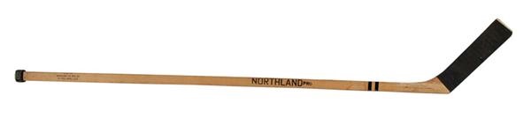 Sensational game used stick from early in Ullman's Hall of Fame career dates from the '57-58 season, one of many in which he lined up alongside the great Gordie Howe. Wrapped with its original tape on the blade and shaft, this exceptional Northland Pro exhibits moderate use throughout the body and is stamped "Ullman" and "Lippman's Tool Shop-Detroit, Michigan" in black ink, in addition to being handwritten with his number "16". Most impressive, though, are the fourteen ballpoint pen signatures (overall grade 8-9/10) that run the length of the stick and include names such as: Howe, Sawchuk, Ullman, Kelly, Kennedy, and more. Several tiny holes on shaft, once used for mounting purposes, do not interfere with the signatures in any way.