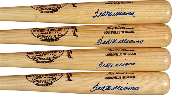 Quartet of single signed bats from Theodore Samuel Williams in one auction lot. Each of these beautiful H&B model bats sports a solid autograph in blue Sharpie underneath facsimile version. All are in Near Mint condition with Upper Deck Authenticated paperwork, velvet bags and boxes. A Splendid investment lot for the patient Ted Collector.
