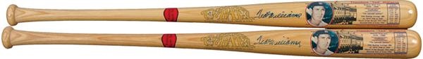 A pair of Cooperstown Bat Company "Famous Player" twigs signed by Teddy Ballgame in blue. Both are Near Mint, with one autograph rating a 9.5/10, and the other a 7.5/10. This is a great Limited Edition series by CBC; the Ted Williams signed bats were offered in 1989, and were sold out very quickly.