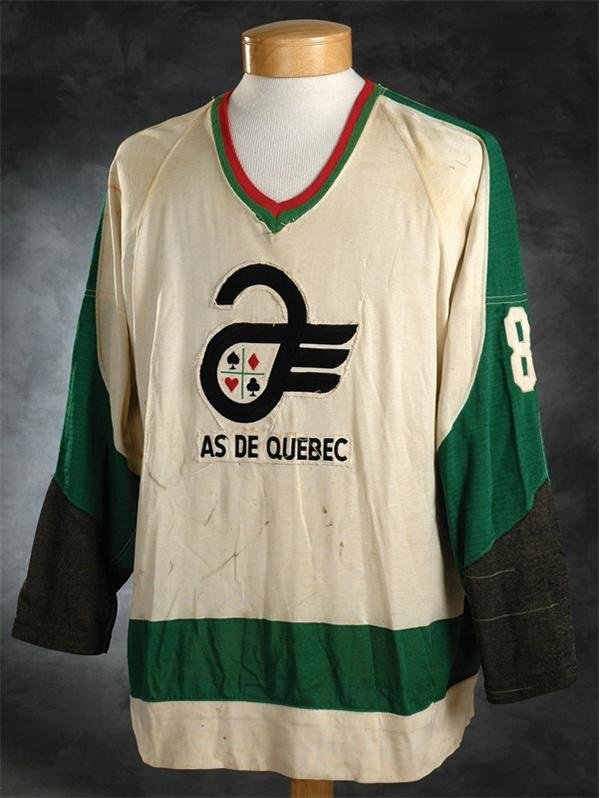 This all original Rosaire Paiement game used hockey jersey has all the markings of a lot of very tough run-ins with the stick and boards, not surprising in that it was worn by him as member of the AHL Quebec Aces circa late 1960's. The Aces crest, busy with its black scripted “A” and encircled heart, clover, diamond and spade, is sewn on its rugged and black-hashed front, while the black #8 is threaded on the back and in white on the sleeves. There is no tag on the collar, but signs of stitch marks tell that once there had been. With only few broken threads on the collar, and a team repair on the front, this is still a surprisingly kept-together survivor from many ice battles. Rosaire played in the NHL with the Flyers and the Canucks, but made his mark as a high scorer in the WHA. LOA signed by Rosaire Paiement.