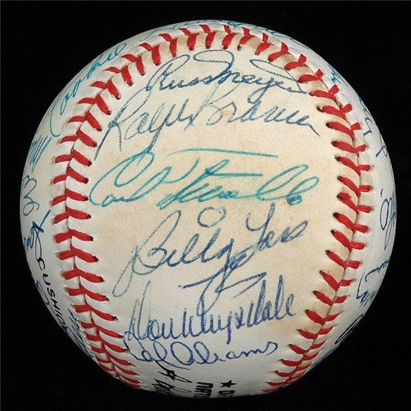 Twenty-eight Dodger blue ballpoint signatures fill the lightly toned surface of this Official National League (Giamatti) baseball. Includes stars who called Brooklyn home, some who called L.A. home, and some who spent some time on both coasts. Highlighted by: Connors, Reese, Amoros, Owen, Black, Lavagetto, Podres, Snider, Herman, Pafko, Bragan, Shuba, Newcombe, Koufax, Gionfrido, Labine, Erskine, Furillo, Drysdale, Branca, and more. Overall the signatures average 8/10 or better on a ball that is EX.