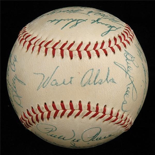 These 1954 Brooklyn Dodgers could truly announce, “Wait ‘til next year,” because, though ’54 had the future “Boys of Summer” finishing second place, in 1955 they would beat the New York Yankees and finally fulfill their promise as World Champs. 21 signatures in all on this Official National League baseball (Giles) from the 1954 team. Ballpoint autographs rate 8-9/10 overall, and include such luminaries as Robinson, Campanella, Hodges, Snider, Reese, Furillo, Gilliam, and Walt Alston (sweet spot), who managed his first of 23 seasons with the Brooklyn/Los Angeles Dodgers. A beauty, in clean EX-MT to NRMT condition.
