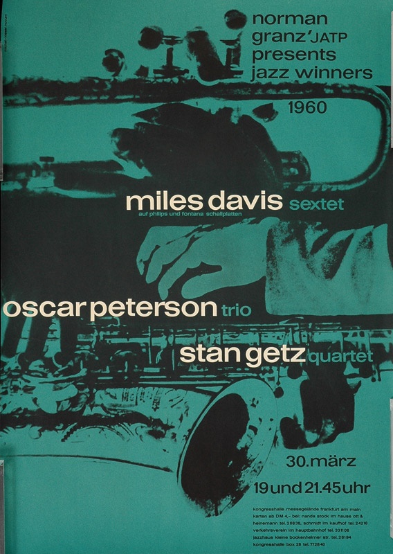 This very hip poster, measuring 16 ? x 23 ?”, advertises one of the legendary concert tours, "Jazz at the Philharmonic", of revolutionary promoter and producer Norman Granz. In 1960, he assembled quite a grouping of artists: the Miles Davis Sextet, the Oscar Peterson Trio and the Stan Getz Quartet, all playing on March 30, 1960, in Germany. Minimal graphics of Davis’ trumpet, Peterson’s piano and Getz’s saxophone dominate this moody, jade and black poster, with understated, cool lower-cased lettering. Atmospheric and evocative, perfect for framing. EX-MT.