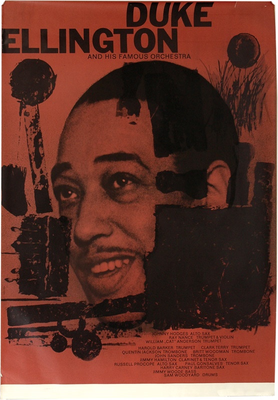 As big as the legend, this large poster, measuring 33 x 47”, interprets Duke Ellington (“and his famous orchestra”) in a wonderfully impressionistic image - organic, earthy, painterly, abstract, and expressionistic, with vague symbols painted in black, all encircling and overlaying upon a photograph of his endearingly joyful face. All in crimson tones of red, it’s a stunning piece of poster art by eminent German poster artists Gunther Kieser and Hans Michel; any of their original jazz posters are rare and always in demand. Highlighted at bottom right are the members of his orchestra, including Johnny Hodges on Alto Sax, Ray Nance on trumpet and violin, and William “Cat” Anderson on trumpet, among other luminary sidemen. Circa late-1950’s/early-1960’s, and in EX condition.