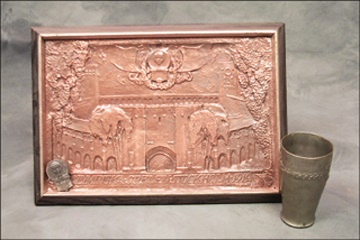 1) Fabulous plaque is a framed cast bronze depicting the Olympic Stadium in remarkable detail. By Hjordis Tengbom it is lovely in its original frame (8x11"). This plaque and visitors pin (below) were advertised for sale in the original 1912 Olympic programs. EX-MT. 2) 1912 Olympic Pewter Cup with oak garland connecting Swedish Coat of Arms within oak wreath. 3.5". VG-EX. 3) First Olympic Official Visitor's Pin. Same design as the First Official Poster. 1.5". EX.