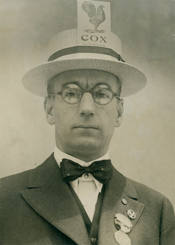This is merely Senator Howell Wright of Cleveland, Ohio. More importantly he is at the San Francisco Democratic Convention and is wearing the campaign material of James Cox, the Democratic candidate for President. Cox is famous for two things. One, that his VP was a young Franklin Delano Roosevelt. Two, that he had very little cash to spend on campaign material, hence the rarity of this photograph. Original paper caption. International Newsreel stamp on verso. EX+. 7.5x11”.