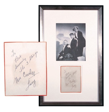 Signed in bold blue fountain pen by Curly, Larry, and Moe (who has added "To Bob Sincerely The 3 Stooges"). The (4 1/2x6") light tan card has aged nicely with some color variation probably from the paper's reaction to paste used on the reverse. A must-have for any worthy Bob!