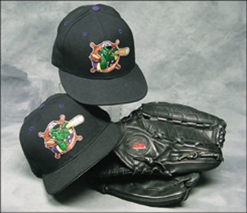 Black Wilson model A2000 glove was worn by the Japanese star pitcher during his final games in his homeland and exhibits fine use. Caps from his minor league squad The Navigators show lighter but definite use as well. All pieces were removed from his locker following the 1996 season by a Yankee source. LOA.