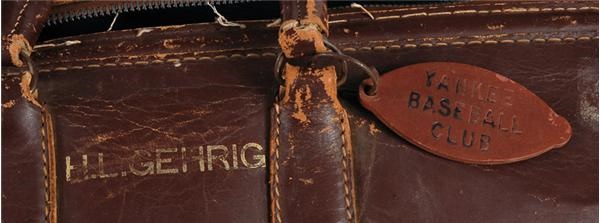 Brown leather bag traveled alongside the Iron Horse Lou Gehrig for what appears to be many a season. Stamped in gold block letters, "H.L. Gehrig" and still with its original "Yankees Baseball Club" wooden luggage tag, it measures 20" in length, is 11" wide and 11" deep. The outer shell shows significant wear along the edges and crease lines, while the inner lining, though lightly stained and soiled on the bottom portion, is in fine condition. Originally obtained many years ago in a grouping that actually included Babe Ruth's bag just like this gem.