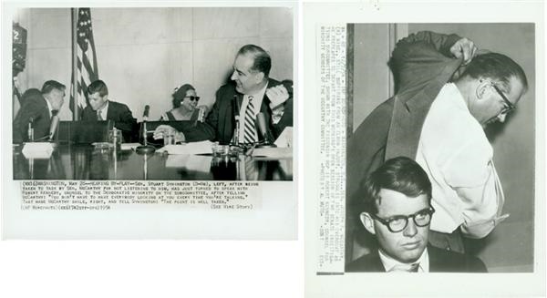 Offered is a pair of photos taken during the height of "The Second Red Scare" of Joseph McCarthy, Chair of Senate Committee on Government Operations and its Senate Permanent Subcommittee on Investigations, and his assistant counsel to the subcommittee, Robert Kennedy. The first was shot during a hearing on the 28th of May, 1954, while the second dates from later that year on December 12th. Both have front copy and the latter owns an International News Photo stamping. NRMT. 8x10".