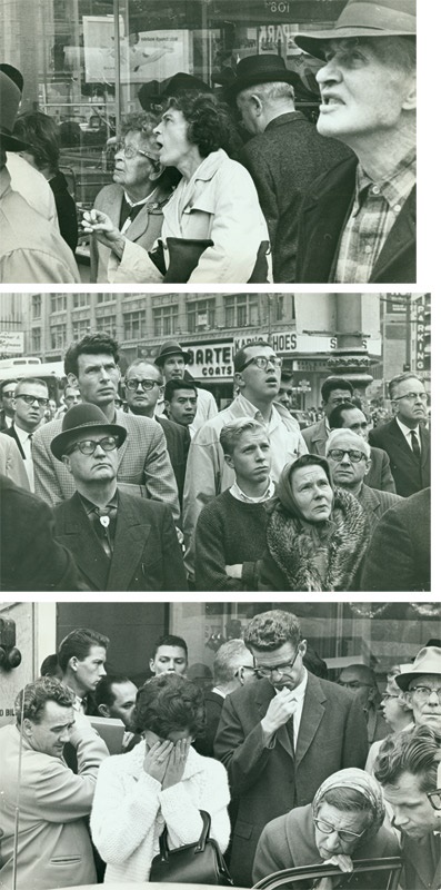 With generational shock waves too deep to be truly measured, these three photographs capture, as best could be, the moments just after knowledge of John F. Kennedy’s assassination hit the streets on November 22, 1963. Not only ominous in their sight unseen subject matter - horrified and pensive looks from everyday citizens gaze off into a collective distance (which actually was a Channel 7 TV news report), these photos also call to mind the recent amassed American tragedy of 9/11, where onlookers stand, terrified and shaken, at a sight above and beyond comprehension. Each measuring roughly 12 x 8”, these are powerful works.