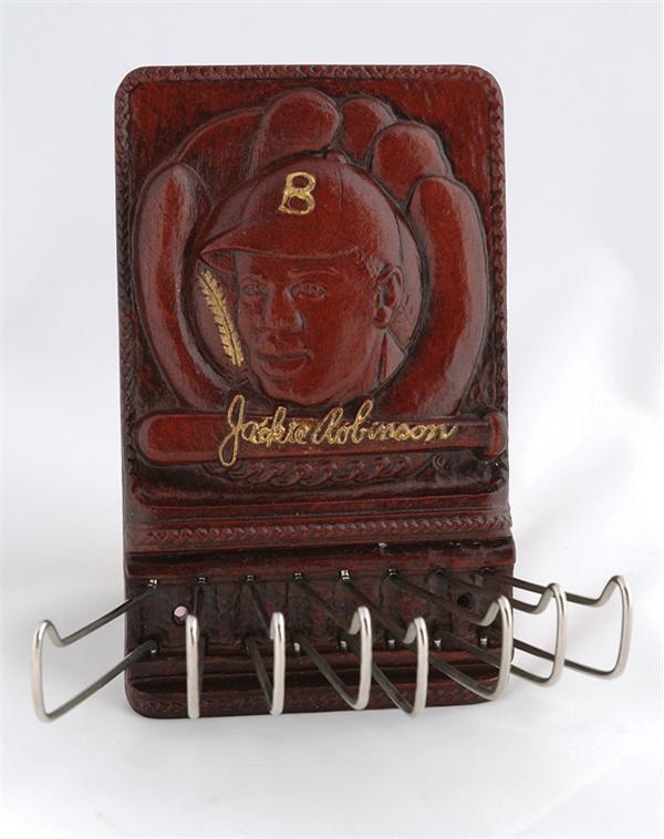 Textured, decorative and functional, this delightful tie rack celebrating baseball icon Jackie Robinson is an amazingly rare item, available only through the Jackie Robinson comic books of the 1950’s. Premium find is a tasteful representation of the Brooklyn Dodger second baseman, with a raised likeness of Jackie upon a baseball and a glove. Made of Masonite, an overall rich brown color, and condition is an incredible NRMT to MINT. Measures 4 ? x 7 ?”.