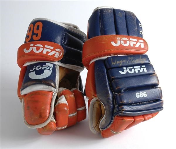 The debate continues endlessly about whether Wayne Gretzky was the greatest hockey player who ever lived. The Hall of Famer has 61 scoring records and an utterly amazing tally of goals and assists and, of course, all those Stanley Cups. Just about anything connected with his illustrious career is amazing and magical, and these game-worn Jofa gloves are a perfect example. Dating to the early to mid-80’s, these gloves were worn during some of the high points of Gretzky’s career - 583 goals for the Oilers, a team which won four Stanley Cups in five years, 1984-1988. These gloves have it all! Showing great signs of regular game use, they are nicely worn and scuffed in all the right places. Both gloves are brightly emblazoned with his legendary number “99” and, best of all, each glove is autographed by Wayne Gretsky in gold sharpie. These historic gloves are sure to be the centerpiece of any collection.