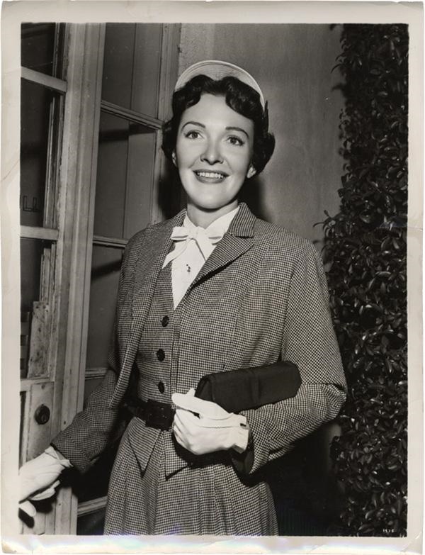 Fine collection of 13 Nancy Davis “Reagan” wire photos, circa late 1940’s to late 1950’s, when she and Ronald Reagan were dating, and married in early 1952. Really, this is a mixture of publicity photos and film tie-ins that span the short acting career of one Nancy Davis (Mrs. Ronald Reagan), where we begin with a high-heeled Davis looking into an airplane cockpit dated April 10, 1949, and end with Nancy and Reagan in her second to last movie, “Hellcats of the Navy", in 1957. She famously stated, "My life really began when I married my husband", and a nice highlight here is photo of the happy couple chatting with a friend. Some to most contain on verso vintage pencil notations, International News Service stamps, original Examiner stamps, photographer stamps, and original paper captions. Despite one photo with a thumbnail piece missing, and a couple with typical folds, this group is in good condition.