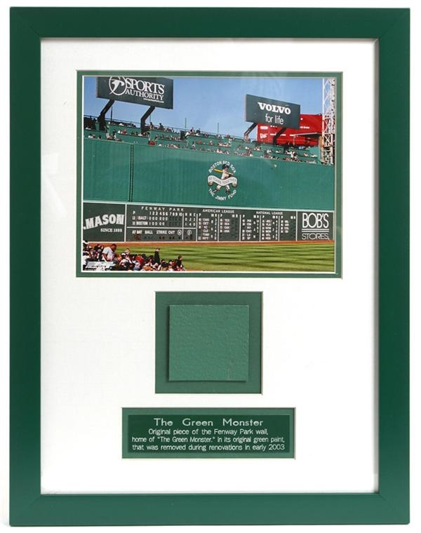 Offered is a genuine piece of the most important and ancient baseball stadium in existence, a 3x3" section of the green facade that made up Fenway's infamous left field wall, known as the Green Monster. Stadium artifact is original and beautifully painted. One of baseball’s few remaining classic ballparks, Fenway has become just as big a piece of baseball lore as the legends it has housed over the years. The ballpark stands almost exactly as it was in 1934 with renovations being few and far between, making this unique item all the more significant. Nicely matted in a display with photo and dedicated plate beneath.