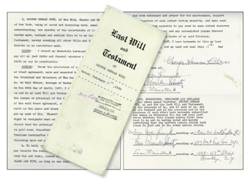 Ex-Barry Halper Collection; originally obtained from Mrs. Babe Ruth. A fascinating historical piece, there are only two known genuine Babe Ruth wills, this is the earlier of the two. There is great controversy as to whether this second probated will from 1948 is indeed valid, as the Babe allegedly signed it when he was incoherent from his fatal illness. On his "deathbed" will he even misspelled his own first name as "Georgge" (with an extra "g") which he then crossed out. The man who signed his name perhaps more times than any man of his time made a mistake in spelling! Theses wills are in a firestorm of controversy at the moment being featured in an April 18, 2001 New York Times article.