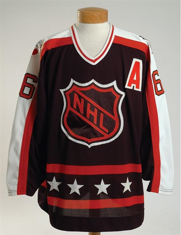 The awe-inspiring center for the Pittsburgh Penguins may or may not have worn this jersey in the 1989 All-Star game (or pre-game activities), but one thing for sure is that Mario Lemieux did wear it. The game was held in Edmonton, on Feb. 7, 1989, and though Gretzky and his Campbell Conference won the game over Lemieux’s Wales Conference, by season’s end Lemieux impressively led the league with 85 goals, and led the league in points with 199, though tied with Gretzky for the league lead in assists with 114. Maska Air -Knit tag in collar with "52" (size) written on it. NHL crest on front with "66" on both sleeves and back. "Lemieux" also on plate on back. 40th NHL All Star Game patch on right sleeve. Assistant captain's "A" on right breast. Light use.