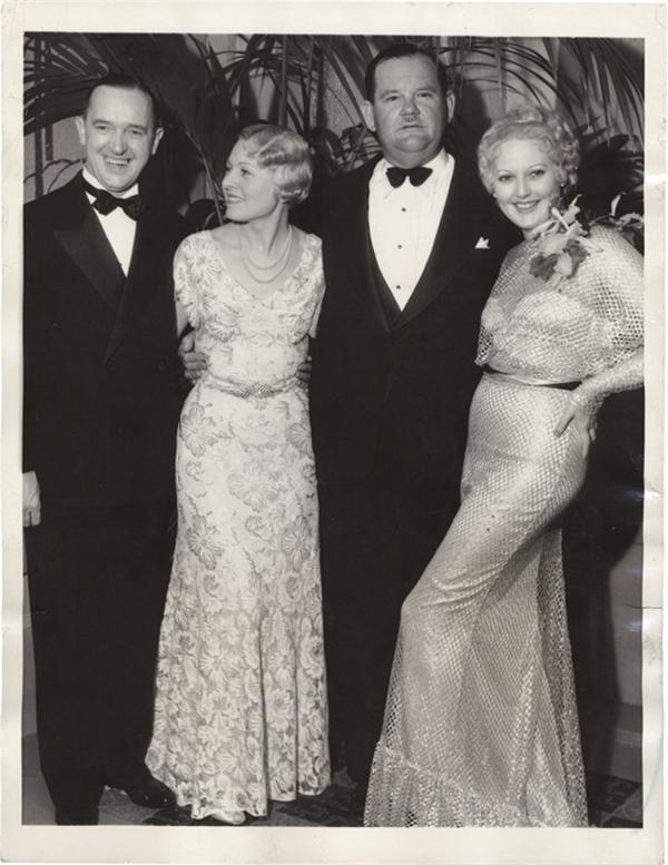 Two of his greatest stars celebrate with 500 others at Hal Roach Studios in Culver City at Roach’s 20th anniversary as a producer. He would go on a lot longer than that. Laurel and Hardy are joined here by Mrs. Roach and actress Thelma Todd whose mysterious death remains still unsolved to this day. Original paper caption. International News stamp on verso. EX. 7x9”.