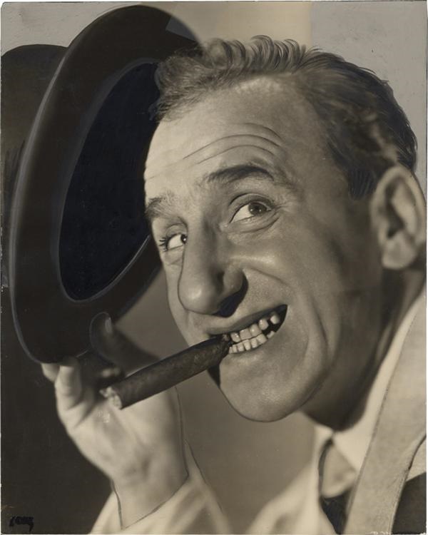 Massive file of material includes everything you always wanted on the Schnozz but was afraid to ask. There are over 150 images here including stills going back to the early 1930's. He is shown with many of the great actors and personalities of America: Wallace Beery, Gary Moore, Al Jolson and Eddie Cantor, Walter Pidgeon, Joe E. Lewis, Phil Silvers, Flipper, Claudette Colbert and George M. Cohan, Ethel Barrymore, Milton Berle, Dean Martin, Ray Bolger, Carmen Miranda, Liberace, Danny Kaye, Edward G. Robinson, Tallulah Bankhead, Mario Lanza, Richard Nixon, Bob Hope, Donald O’Connor, Jerry Lewis, Burl Ives, Joan Blondell, Lupe Velez (3), Myrna Loy, radio’s Aunt Jemima (Tess Gardel), Martha Raye, Dick Van Dyke, and Casey Stengel. Plus, there is some amazing stuff of Durante showing his incredible personality and talent. There is even his nose getting cast in cement at Grauman’s Chinese Theater and him dressed as a Beatle. Overall EX and 7x9".